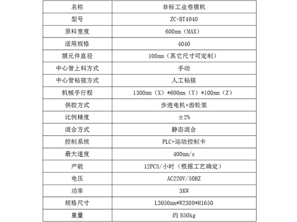 該設備主要用于非標4寸工業膜元件,人機操作界面,平臺放置膜片,機械手打膠線,導流布成卷放置,膜元件自動收卷切割導流布,纏繞外層膠帶,一人操作即可。